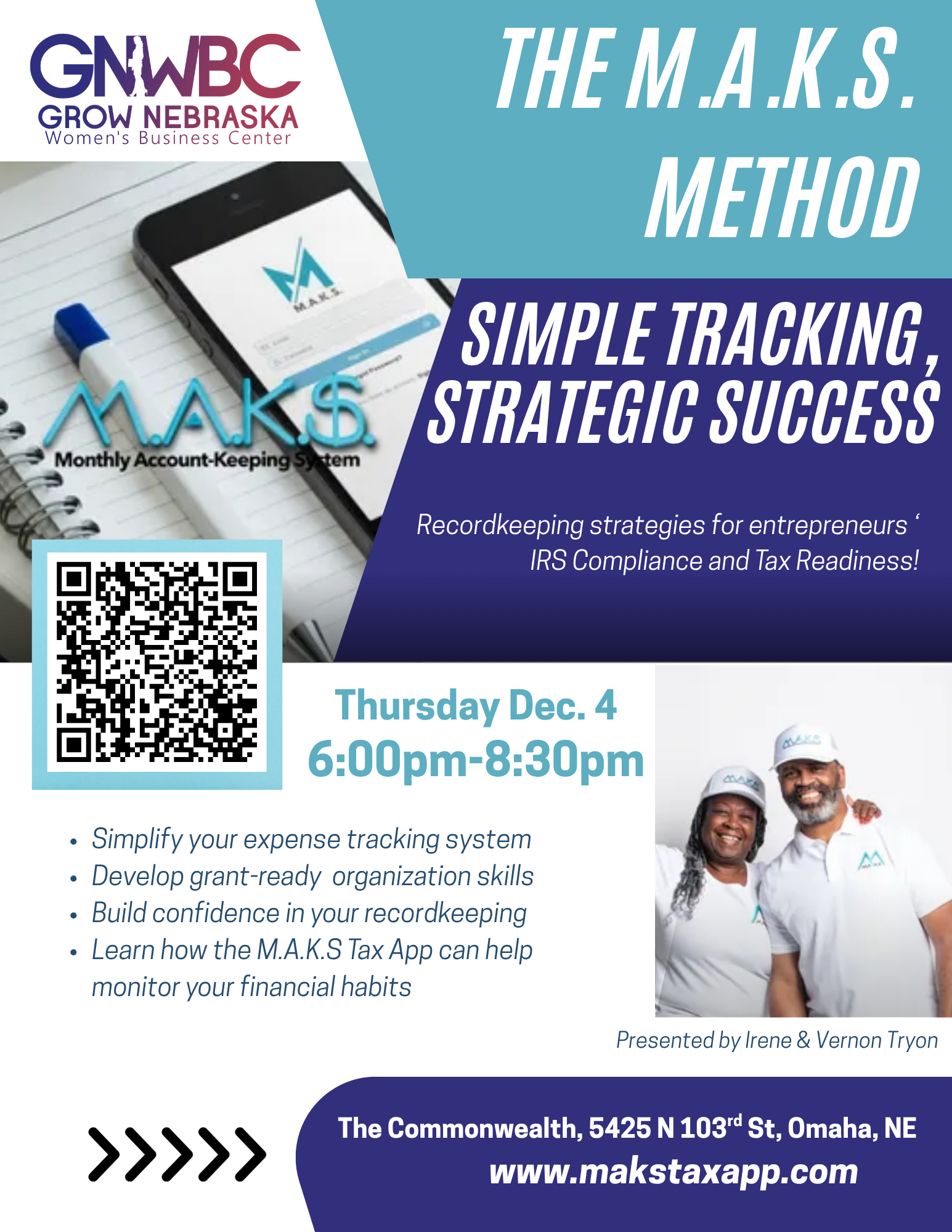 Join GNWBC and Irene & Vernon Tryon of YBusiness Solutions to learn how their M.A.K.S. Tax app can help you monitor your financial habits! This workshop will cover a range of recordkeeping strategies to ensure IRS Compliance and Tax Readiness for entrepreneurs.
